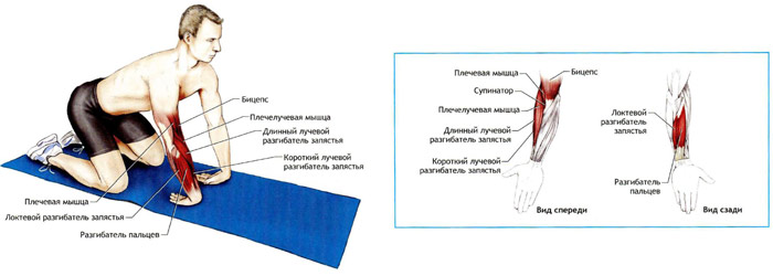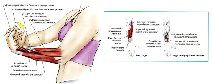 В большей степени: плечелучевая мышца, короткий лучевой и длинный лучевой разгибатели запястья, локтевой разгибатель запястья.
