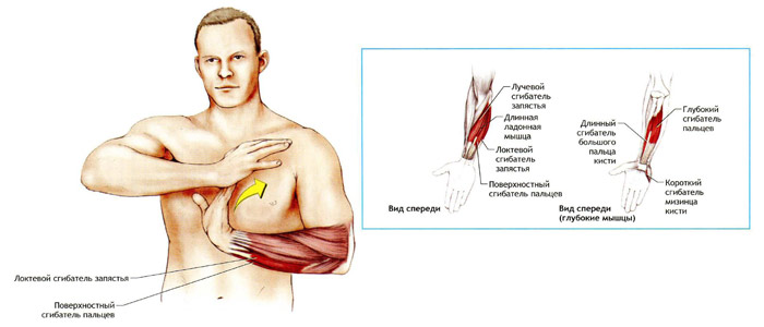 В большей степени: лучевой сгибатель запястья, глубокий и по­верхностный сгибатели пальцев, длинная ладонная мышца.