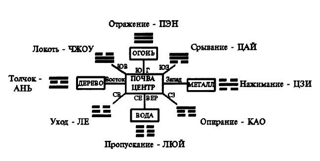 Рис. 1. Связь движений со сторонами света, пятью стихиями и восемью триграммами.