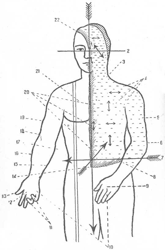 Схема осей и плоскостей в теле человека (по проф. В. Воробьеву), , активно применяемая на практике в самбо и издаваемая в учебниках в 1940 году.